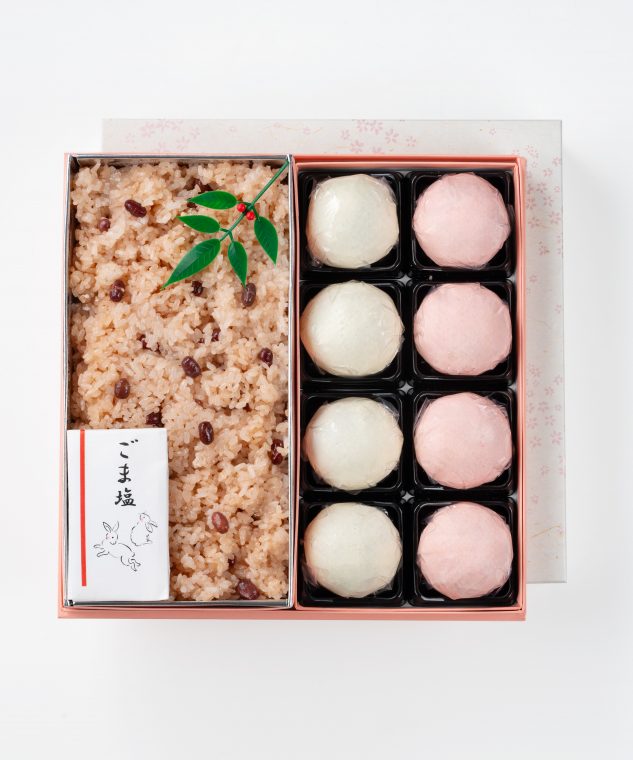 紅白まんじゅうとお赤飯がセットになった「おめでとうセット」は華やかな桜の柄の化粧箱でご用意いたします。こちらもお名前入りの掛け紙をお付けできますので内祝いにも最適です。